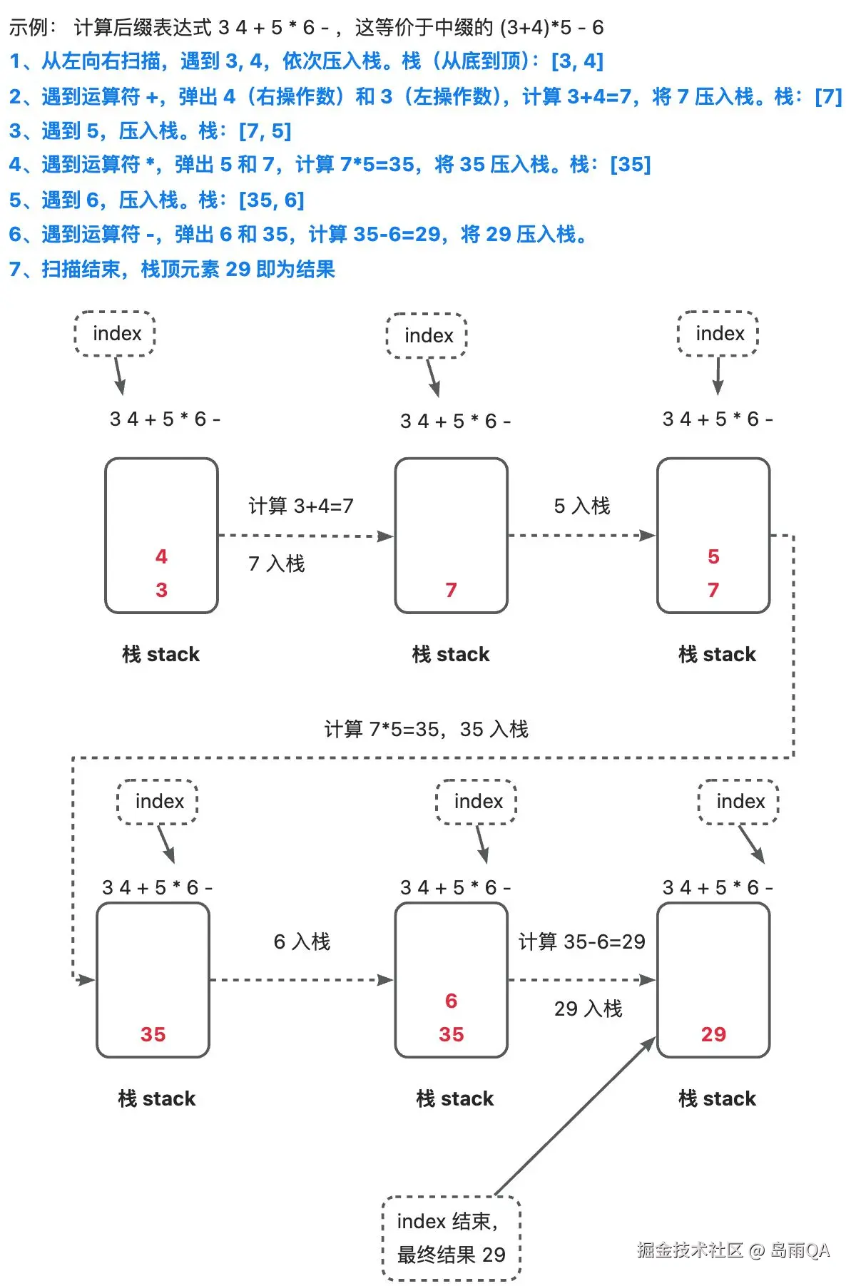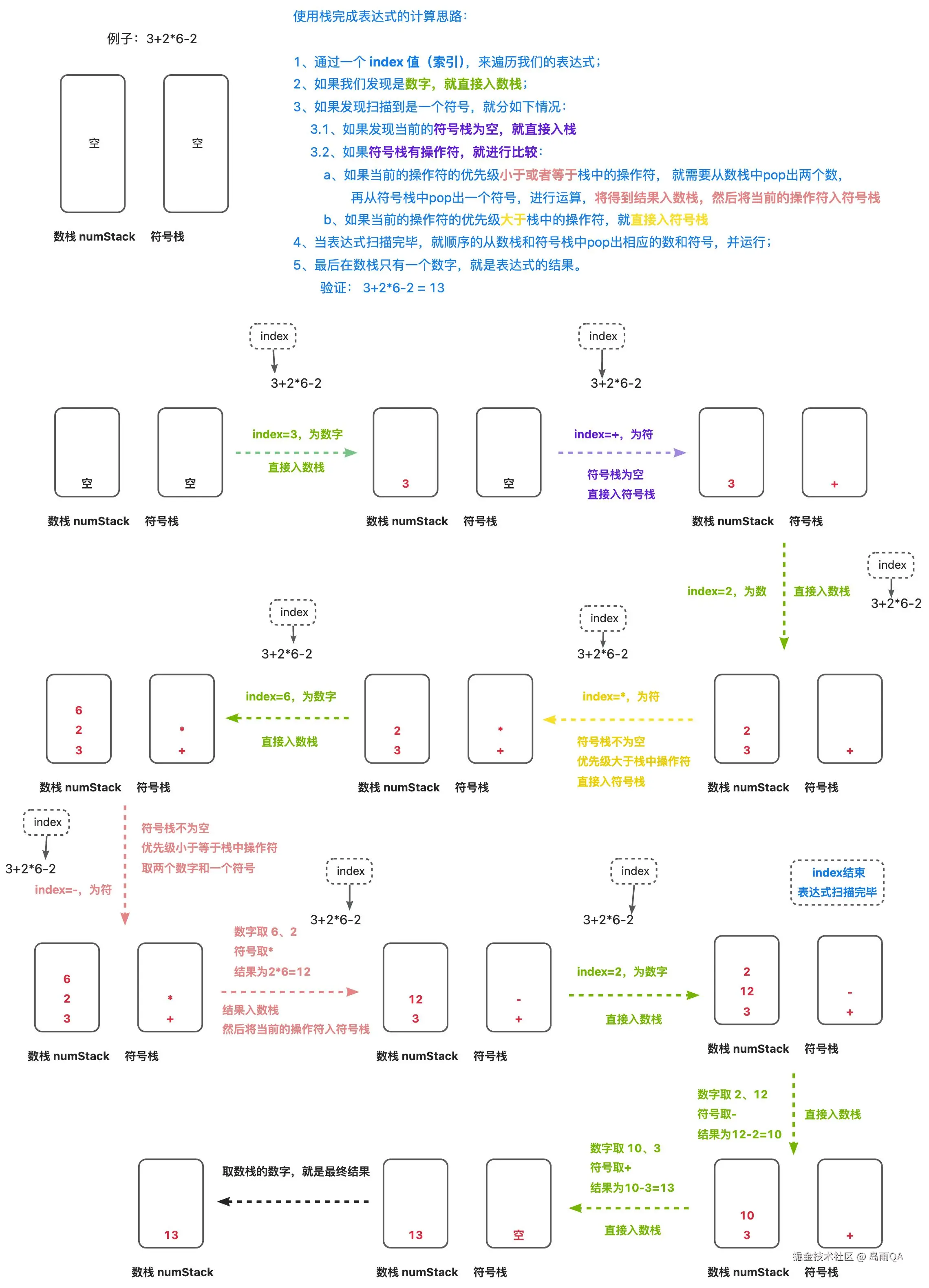 请问: 计算机底层是如何运算得到结果的?注意不是简单的把算式列出运算,因为我们看这个算式 7 * 2 * 2 - 5,但是计算机怎么理解这个算式的(对计算机而言,它接收到的就是一个字符串),我们讨论的是这个问题。-> 用栈解决