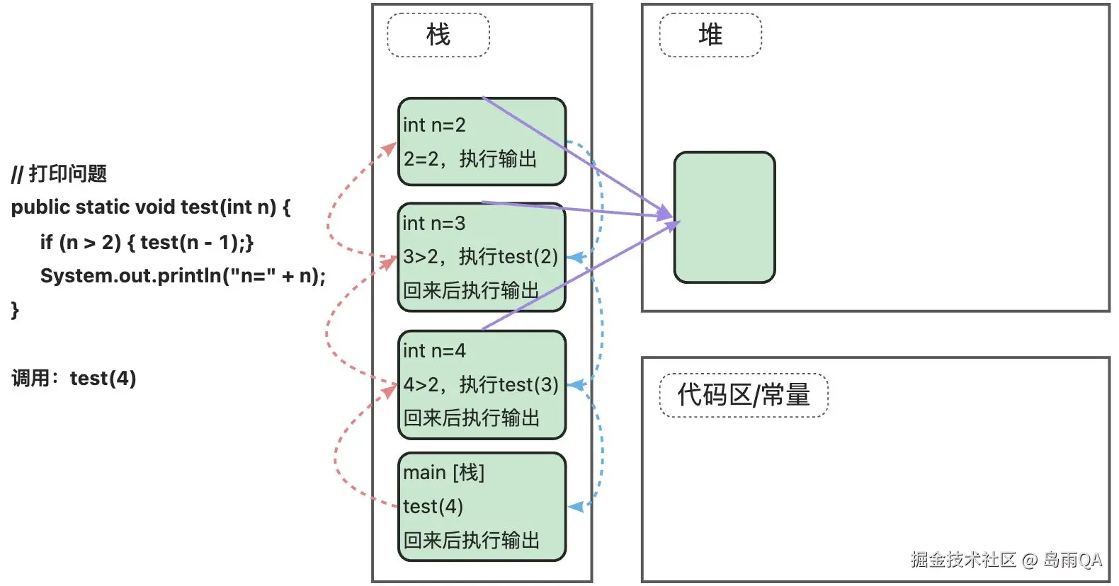 - 递归必须向退出递归的条件逼近,否则就是无限递归,出现StackOverflowError(栈溢出)