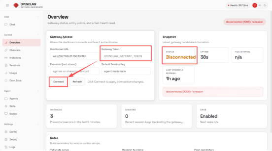 10 webui界面,需要输入token然后点击连接,这里容器环境中我们已经提前配置好了token,也就是下面这个,后面也可以自行修改。