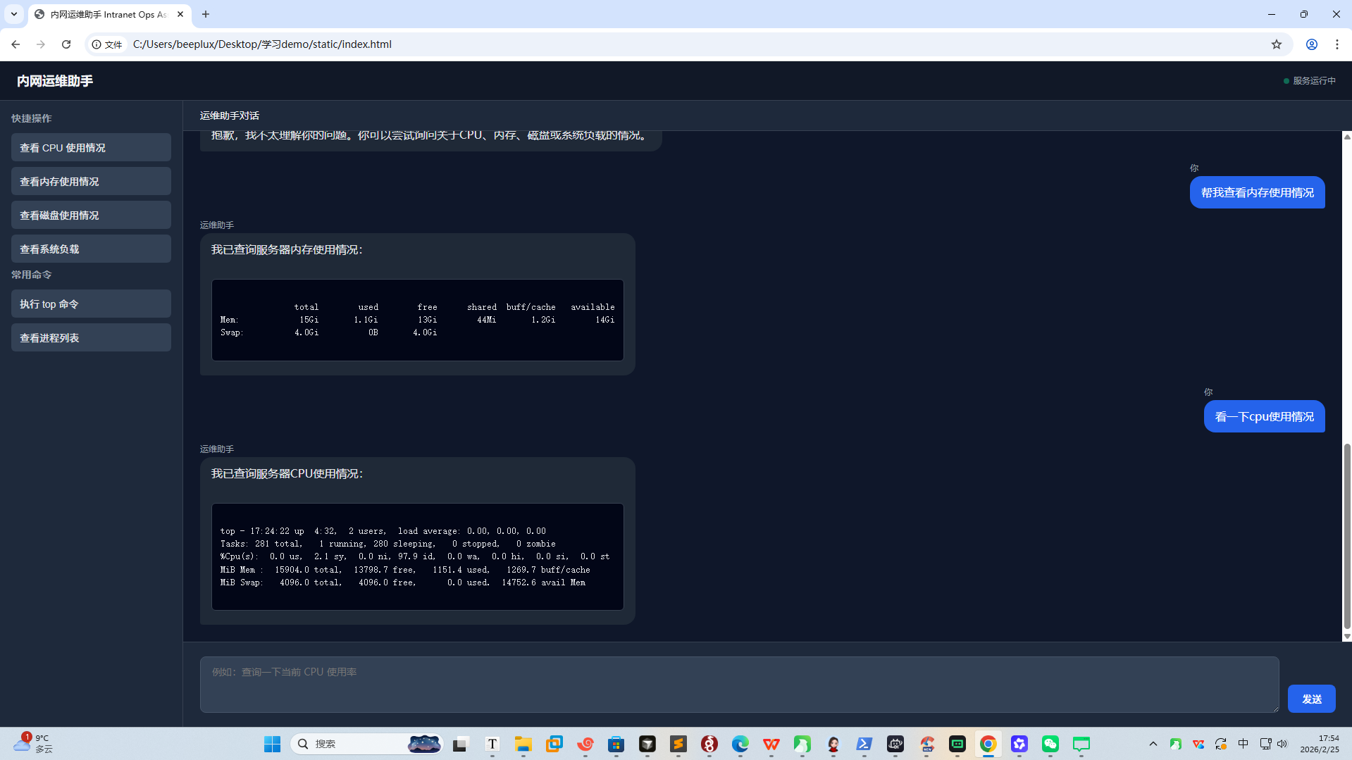 - 自然语言输入框:支持用户用日常语言提问(如"帮我看一下当前CPU使用情况");