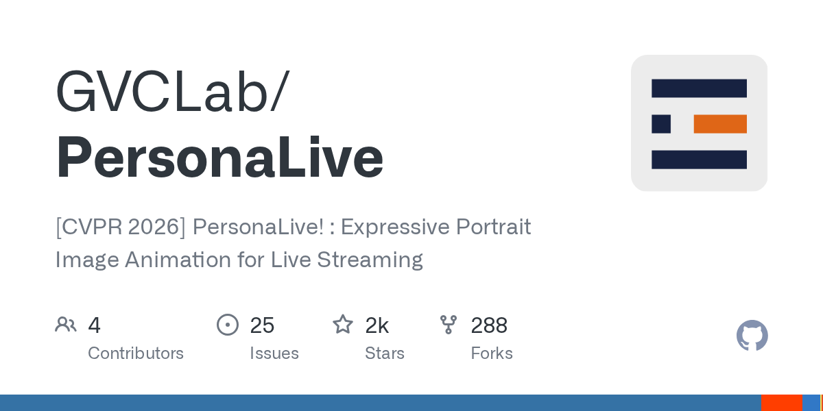 - 💡 推荐语: 人像直播动画工具PersonaLive,基于CVPR 2026的前沿算法,能为实时直播生成高度富有表现力的人像动画,帮助主播与视频创作者低成本制作生动有趣的互动内容。