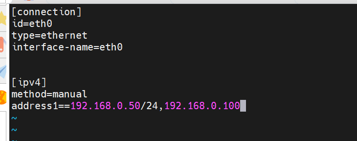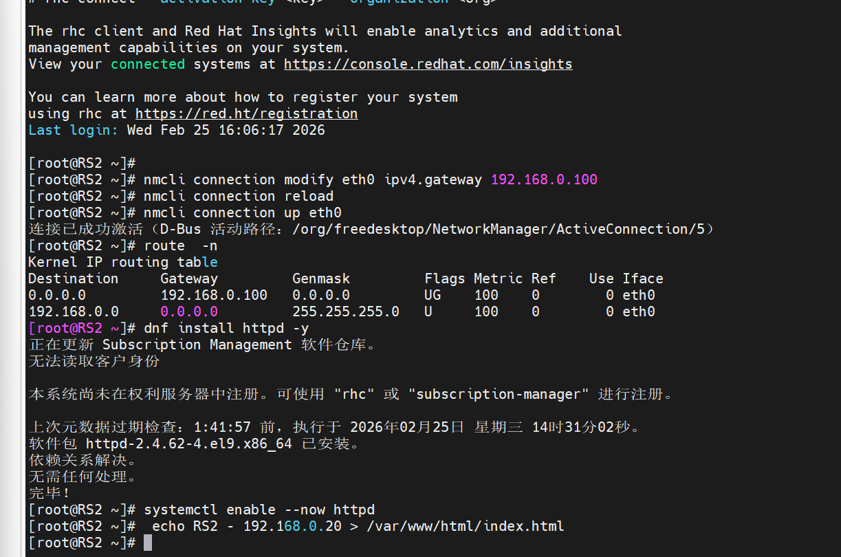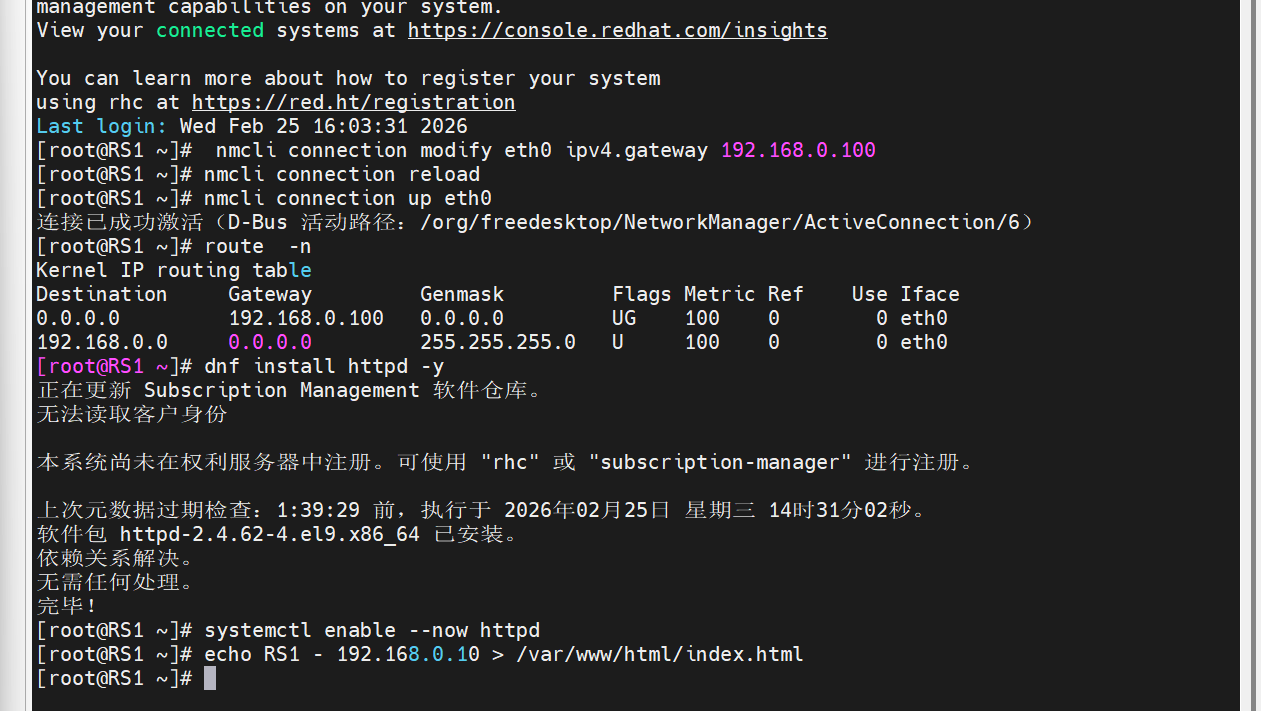 [root@RS1 ~]# nmcli connection modify eth0 ipv4.gateway 192.168.0.100