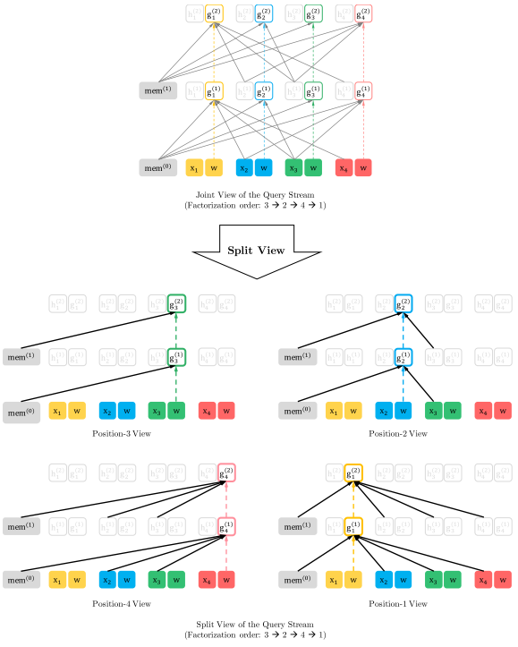 Fig.5:在分解顺序[3,2,4,1]下,基于长度-4序列的联合视图和分割视图的所提出目标的内容流的详细说明。注意,如果我们忽略查询表示,则该图中的计算只是标准的自注意力机制,尽管使用了特殊的注意掩码。
