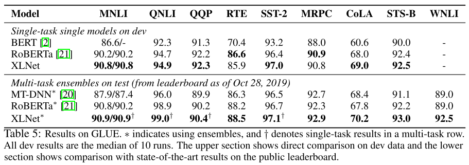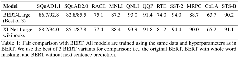 为了排除数据量的干扰,作者训练了只使用 Wikipedia + BooksCorpus 的 XLNet-Large-wikibooks,与三个 BERT-Large 变体的最优结果对比: