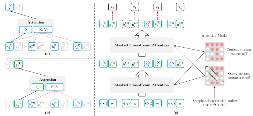 (a) 内容流注意力掩码,(b) 查询流注意力掩码,(c) 双流注意力整体结构概览