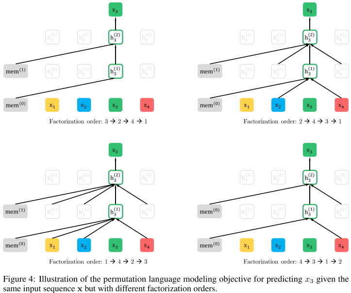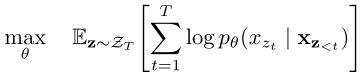 其中 Z_T 是长度 T 的所有排列的集合,z_t 是某排列中第 t 个位置,z_{<t} 是其前 t-1 个位置。