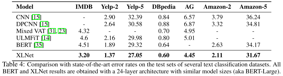 值得注意的是,即便在 MNLI(>39 万条)、Yelp(>56 万条)、Amazon(>300 万条)等已有大量监督样本的任务上,XLNet 仍能带来显著提升,说明其预训练质量本身更高,而非仅靠数据量取胜。