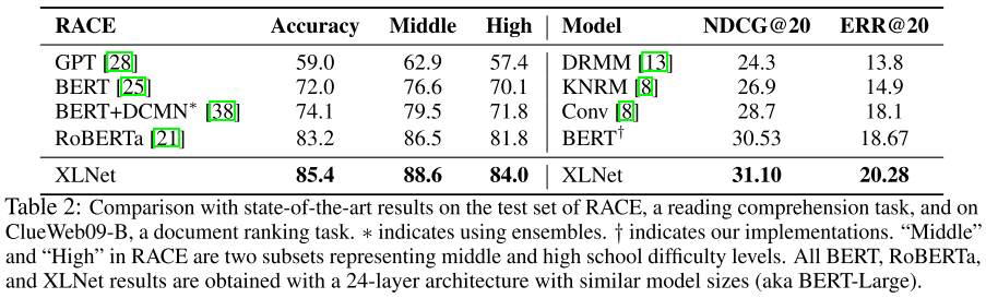 RACE 数据集平均段落长度超过 300,对长文本理解能力要求极高,XLNet 的 Transformer-XL 骨干在此体现出优势。