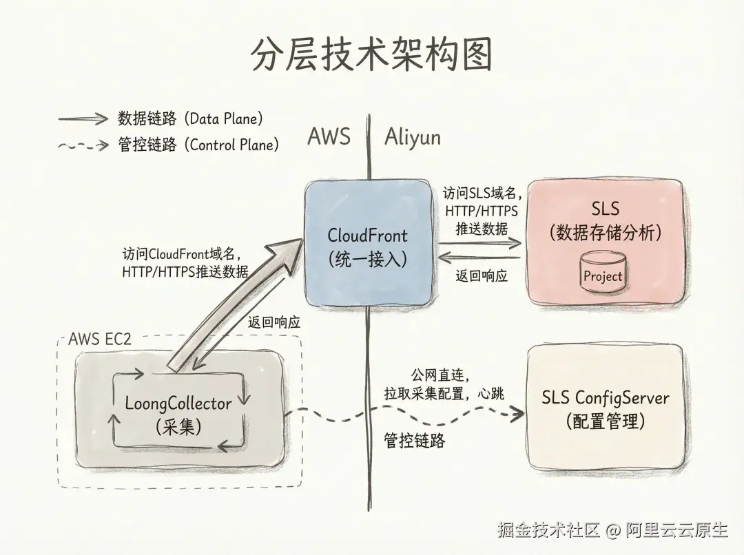 1\] LoongCollector 官方文档 [github.com/alibaba/loo...](https://link.juejin.cn?target=https%3A%2F%2Fgithub.com%2Falibaba%2Floongcollector "https://github.com/alibaba/loongcollector") \[2\] AWS CloudFront 官方文档 [docs.aws.amazon.com/cloudfront/](https://link.juejin.cn?target=https%3A%2F%2Fdocs.aws.amazon.com%2Fcloudfront%2F "https://docs.aws.amazon.com/cloudfront/") \[3\] 阿里云 SLS 官方文档 [help.aliyun.com/zh/sls/](https://link.juejin.cn?target=https%3A%2F%2Fhelp.aliyun.com%2Fzh%2Fsls%2F "https://help.aliyun.com/zh/sls/")