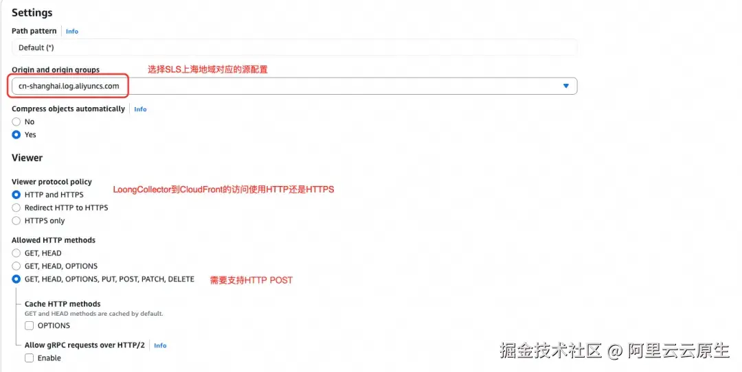 - CloudFront 再将请求回源转发到阿里云 SLS 写入端