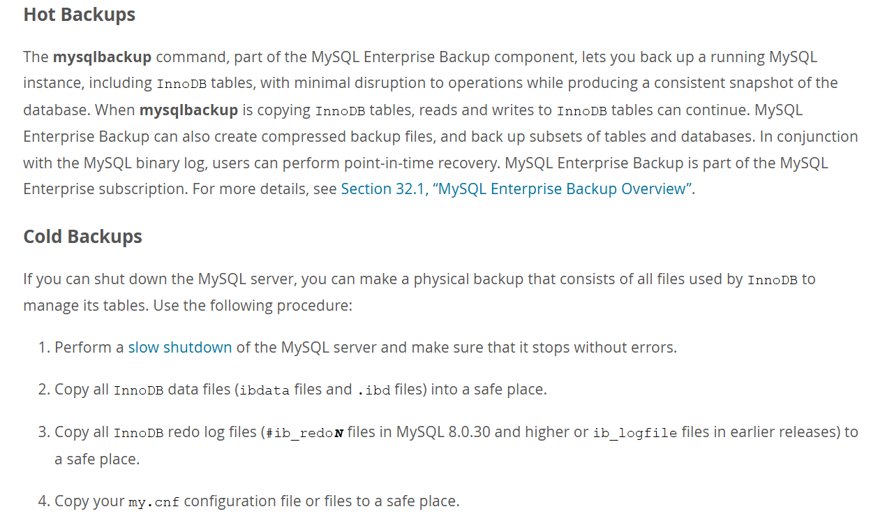 mysql对于数据的导入导出提供了逻辑操作与物理操作两种方式,其中mysqdump的逻辑操作往往需要生成SQL文件,如果数据量比较大,可能执行的效果比较差,耗时比较长。本文主要介绍一下基于mysql文件层面的物理操作,也可以叫做冷备份。