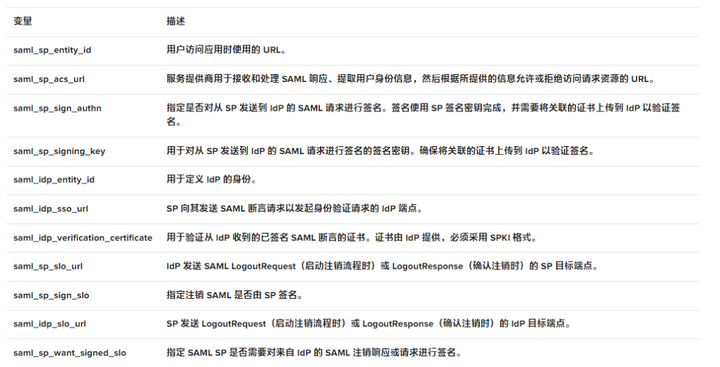 若要使用公钥验证签名,需要将 $saml_sp_sign_authn 设置为 true,以指示 SP 对发送给 IdP 的 AuthnRequest 进行签名。