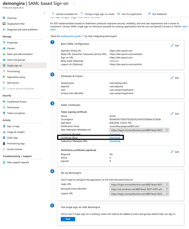 从 Microsoft Entra ID 下载 IdP Certificate (Raw)(证书(原始格式)),并将其保存到 NGINX Plus 实例中。
