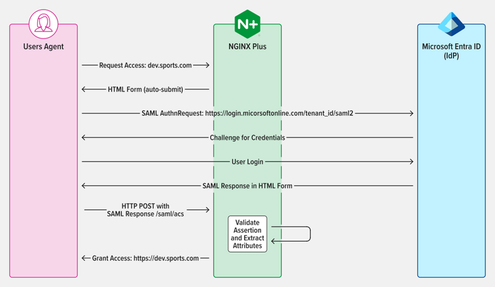 在使用 NGINX Plus 配置 SAML SP 和使用 Microsoft Entra ID 配置 IdP 后,必须验证 SAML 流。此验证流程可确保用户通过 IdP 成功进行身份验证,并获准访问受 SP 保护的资源。