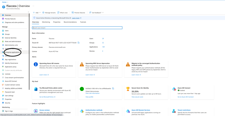 要访问 Microsoft Entra ID 管理门户,请登录并导航到左侧面板。选择 Microsoft Entra ID,然后点击需要 SSO 配置的目录标题。完成后,选择 Enterprise applications(企业应用)。