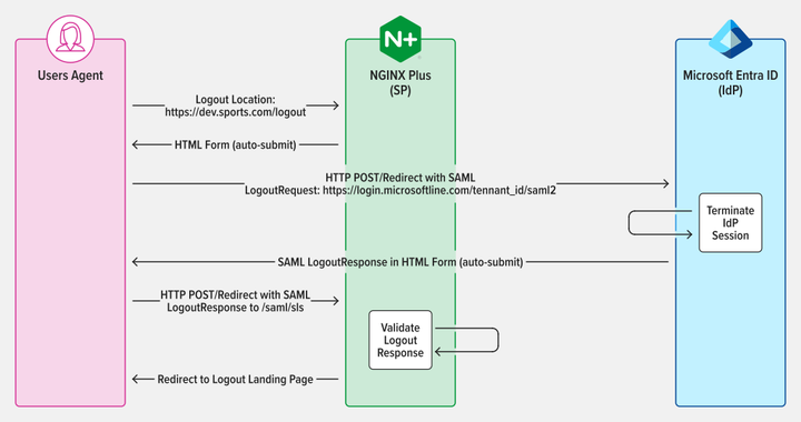 SAML 单点注销 (SLO) 允许用户只需一次操作即可注销所有相关的 IdP 和 SP。NGINX Plus 支持 SP 发起和 IdP 发起的注销方案,可增强 SSO 环境中的安全防护并提升用户体验。在本例中,我们使用 SP 发起的注销方案。