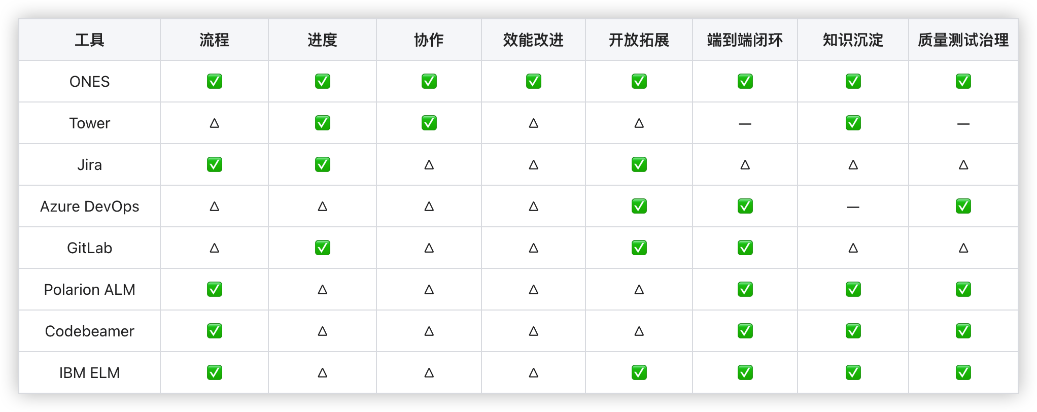 评分口径:使用三档标识------✅强(原生闭环/可规模化)、△可用(需较多配置或依赖生态)、---偏弱(更适合由其他系统承担)。评分用于快速定位,不是绝对优劣。