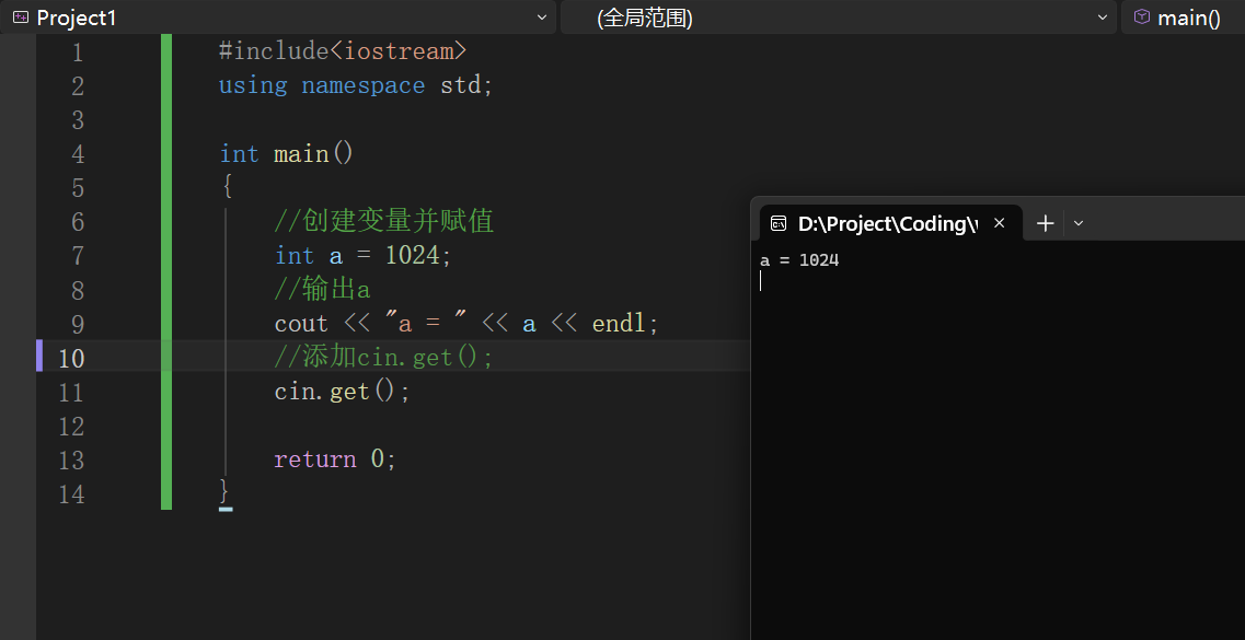 通过调用 cin.get();,程序会停在该行等待输入,从而让你有足够时间查看输出内容(例如 "Hello World")。