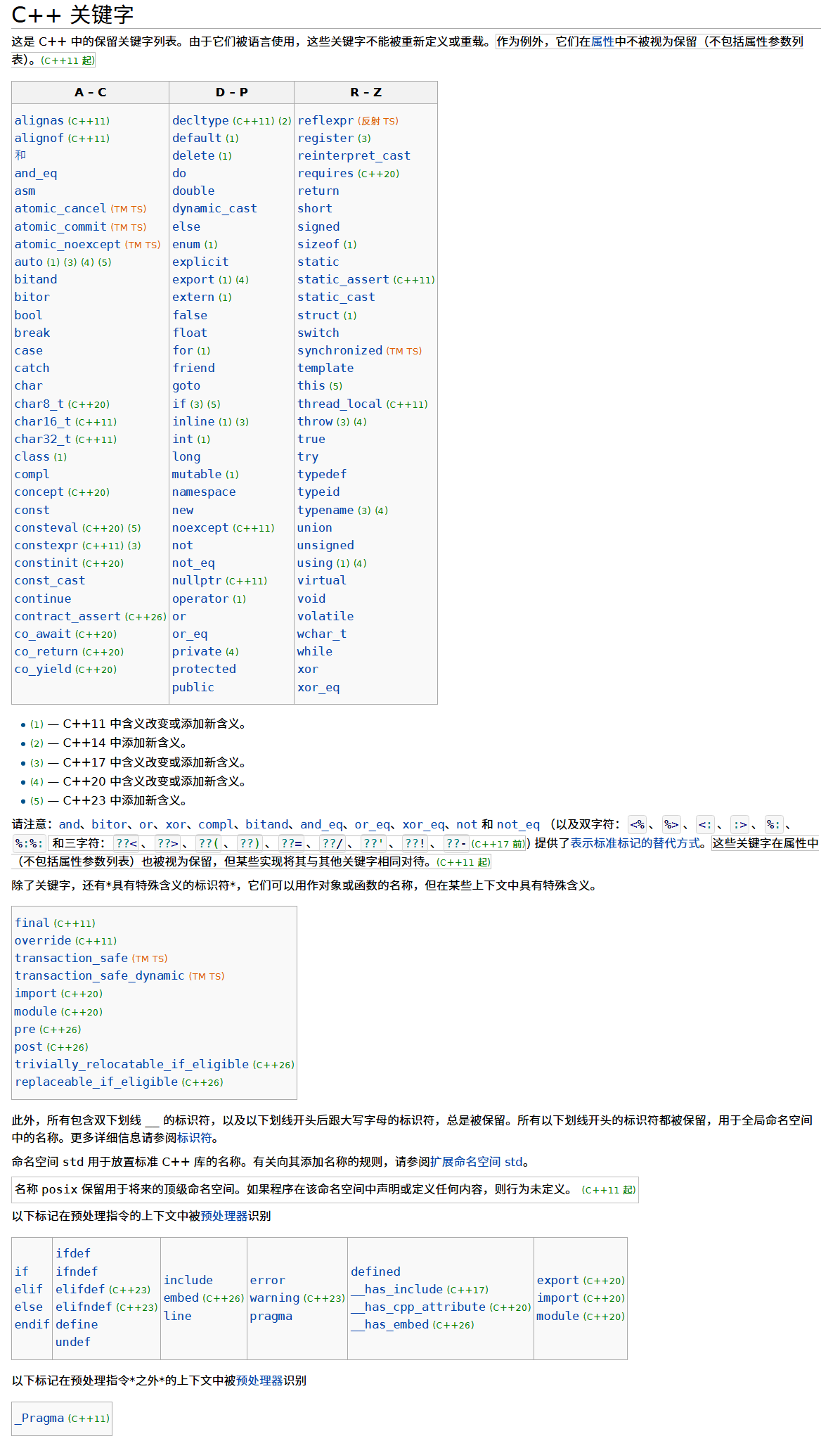 - [6.2 C++关键字表](#6.2 C++关键字表)