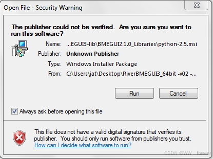安全警告对话框(取决于Windows安全设置)可能会允许出现,如下所示: