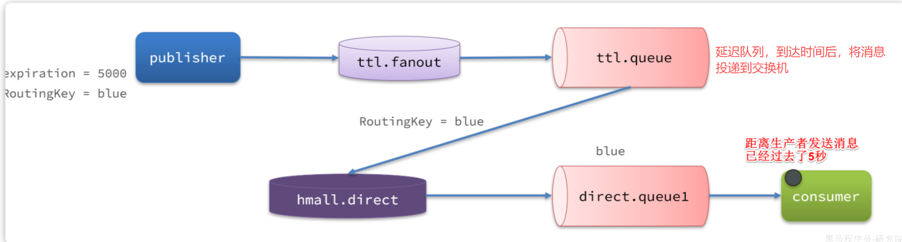3.实现延迟:给消息设置 TTL,队列无消费者,消息到期后成为死信,通过死信交换机路由到消费队列,实现延迟消费