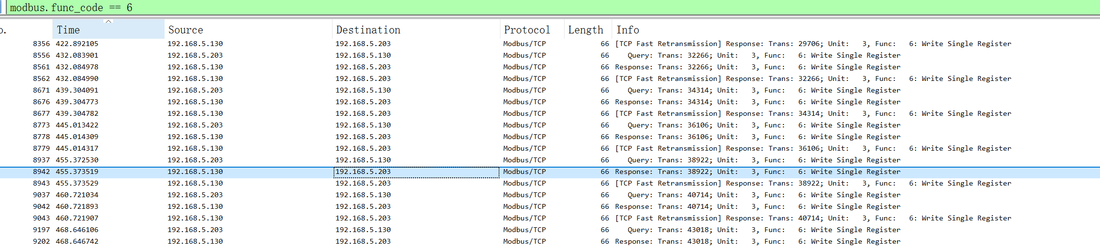 这里面我们只要使用的是3、5、6。我们一开始查找func为5的流量的时候会发现data的值为ff00,这是指线圈的开启指令。所以过一遍之后我们就可以看参数6里的一些信息了。