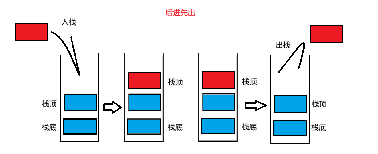核心特点:后进先出(LIFO),所有操作(入栈、出栈)仅在栈顶进行。