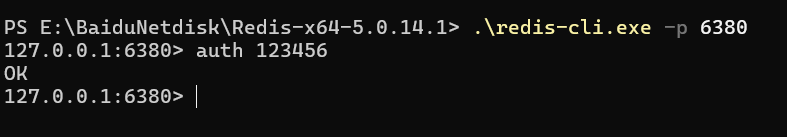 启动客户端 .\redis-cli.exe -p 6380, 输入密码登录成功