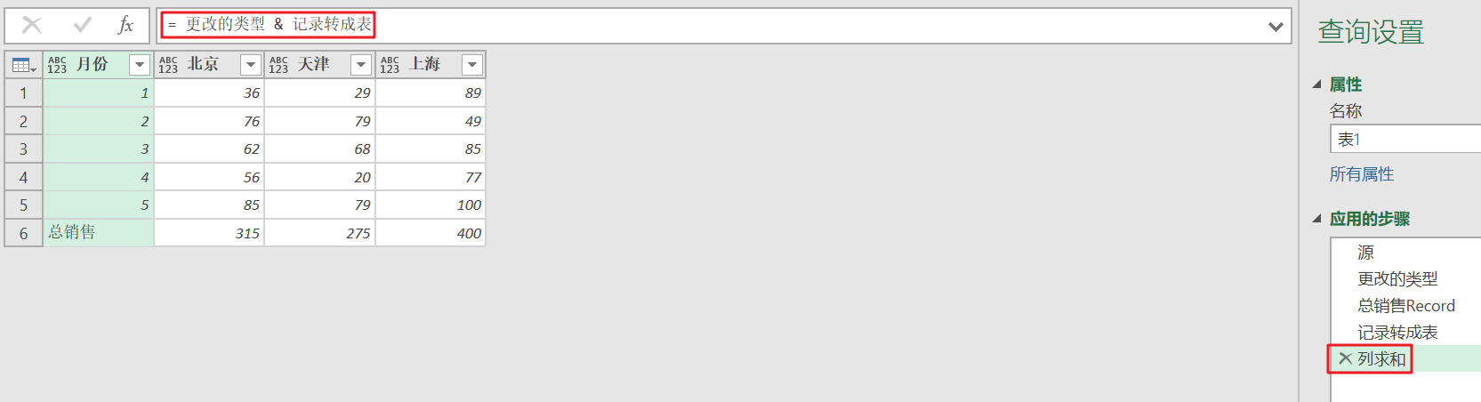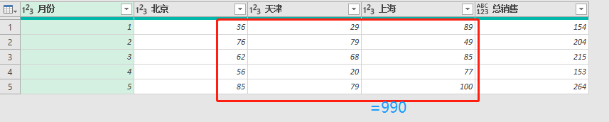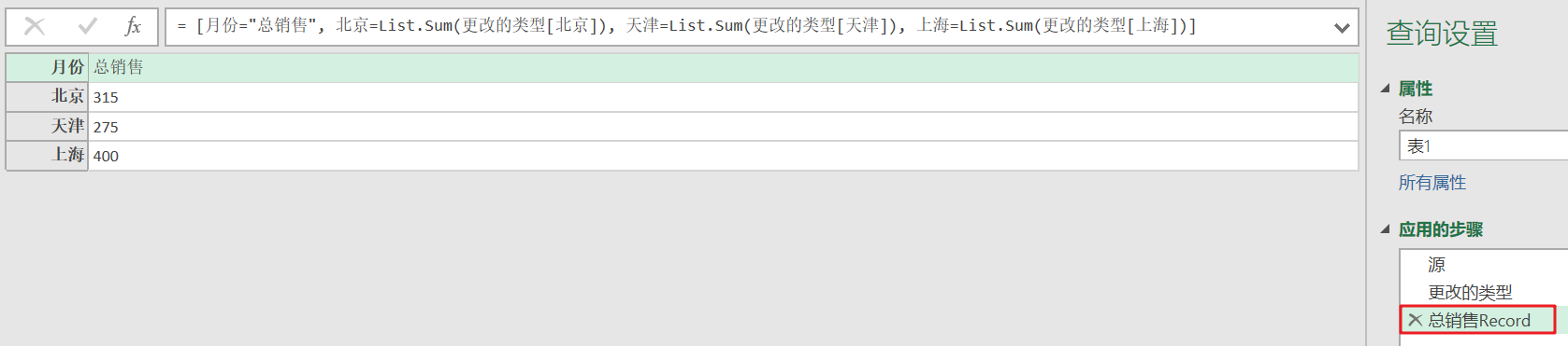 = [月份="总销售", 北京=List.Sum(更改的类型[北京]), 天津=List.Sum(更改的类型[天津]), 上海=List.Sum(更改的类型[上海])]