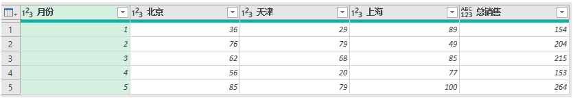 更改的类型 = Table.TransformColumnTypes(源,{{"月份", Int64.Type}, {"北京", Int64.Type}, {"天津", Int64.Type}, {"上海", Int64.Type}}),