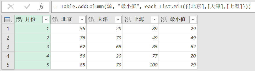 = Table.AddColumn(源, "最小值", each List.Min({[北京],[天津],[上海]}))