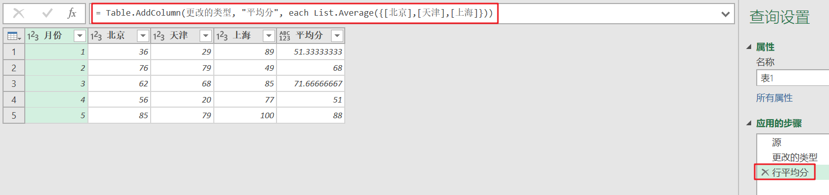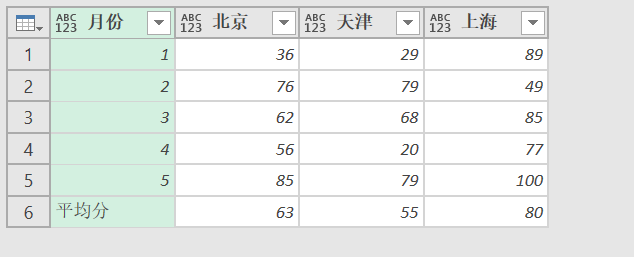 列平均值 = [月份 = "平均分" ,北京=List.Average(更改的类型[北京]),天津=List.Average(更改的类型[天津]),上海=List.Average(更改的类型[上海])],