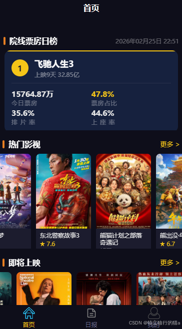 本文基于爱影家(imovie)项目,详细介绍如何使用 uni-app x 技术栈开发一个院线票房日榜组件(box-office)。该组件展示实时院线票房数据,包括今日票房、票房占比、排片率、上座率四项核心指标,以横向翻页卡片的形式呈现,视觉上干净现代。