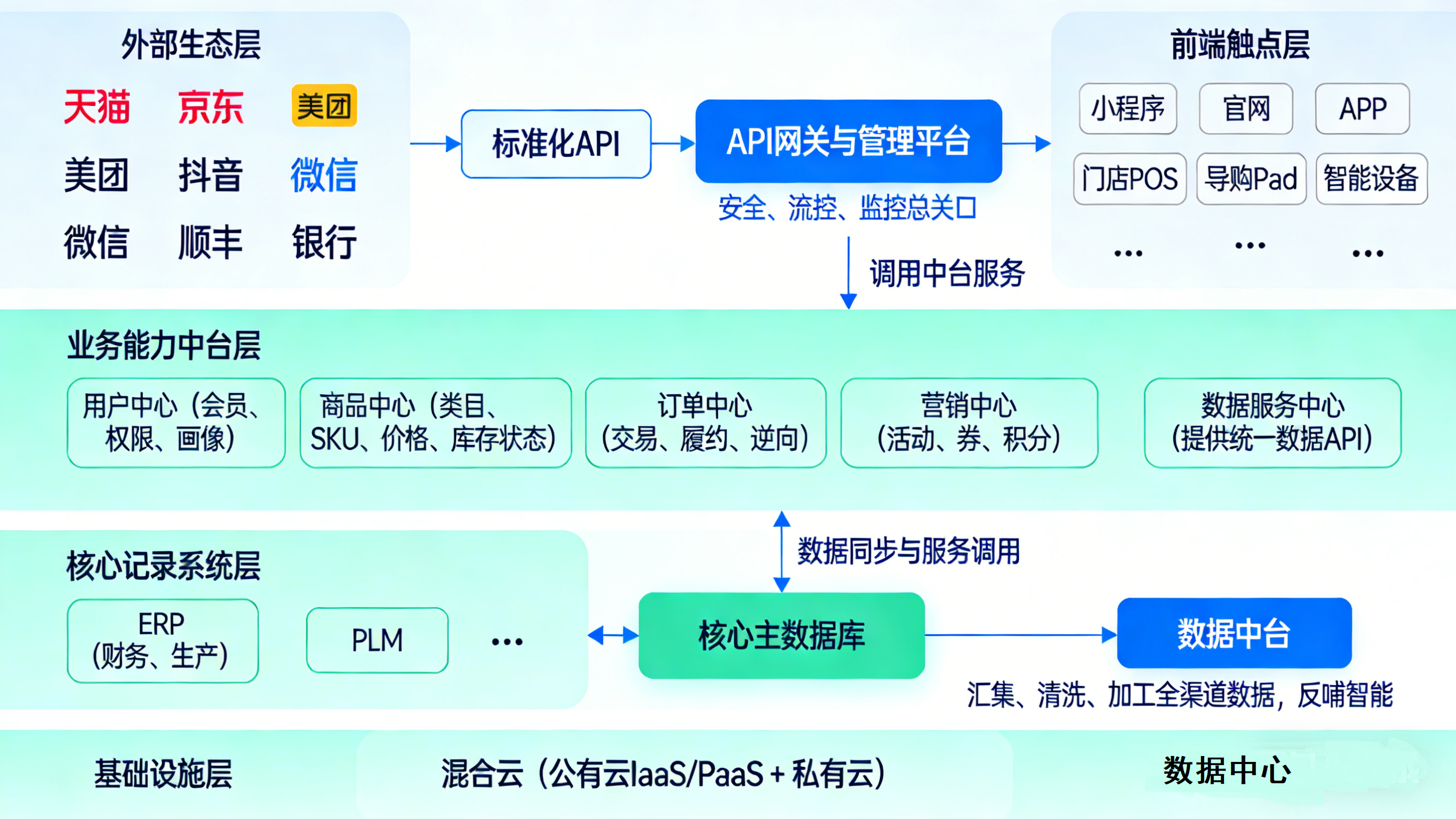 这张图描绘了一个 "前敏后稳" 的二元模式。前台(触点层)轻盈多变,通过API网关调用中台的标准化能力,实现快速创新。后台(核心系统)厚重稳定,通过数据同步和服务化封装,为前台和中台提供可靠的"基石"数据与服务。数据中台和混合云基础设施贯穿上下,提供燃料和跑道。API则是连接一切的血管。