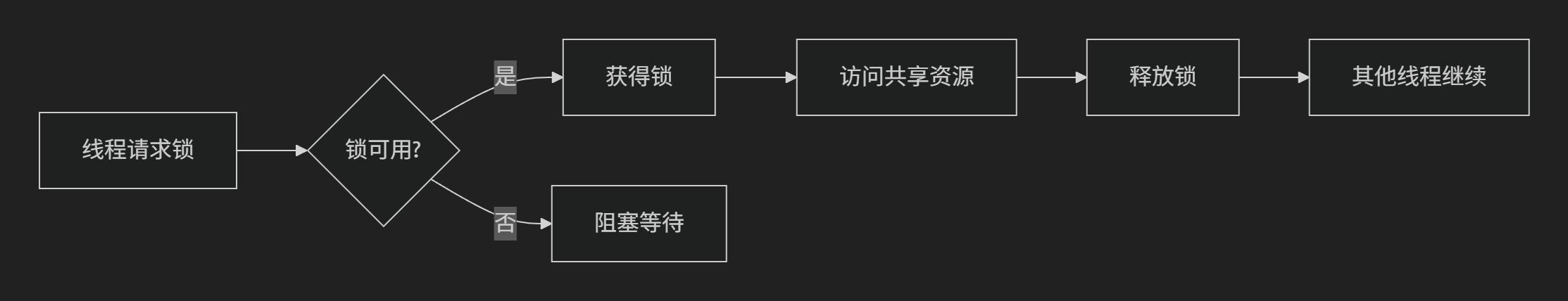 graph LR A[线程请求锁] --> B{锁可用?} B -->|是| C[获得锁] B -->|否| D[阻塞等待] C --> E[访问共享资源] E --> F[释放锁] F --> G[其他线程继续] -