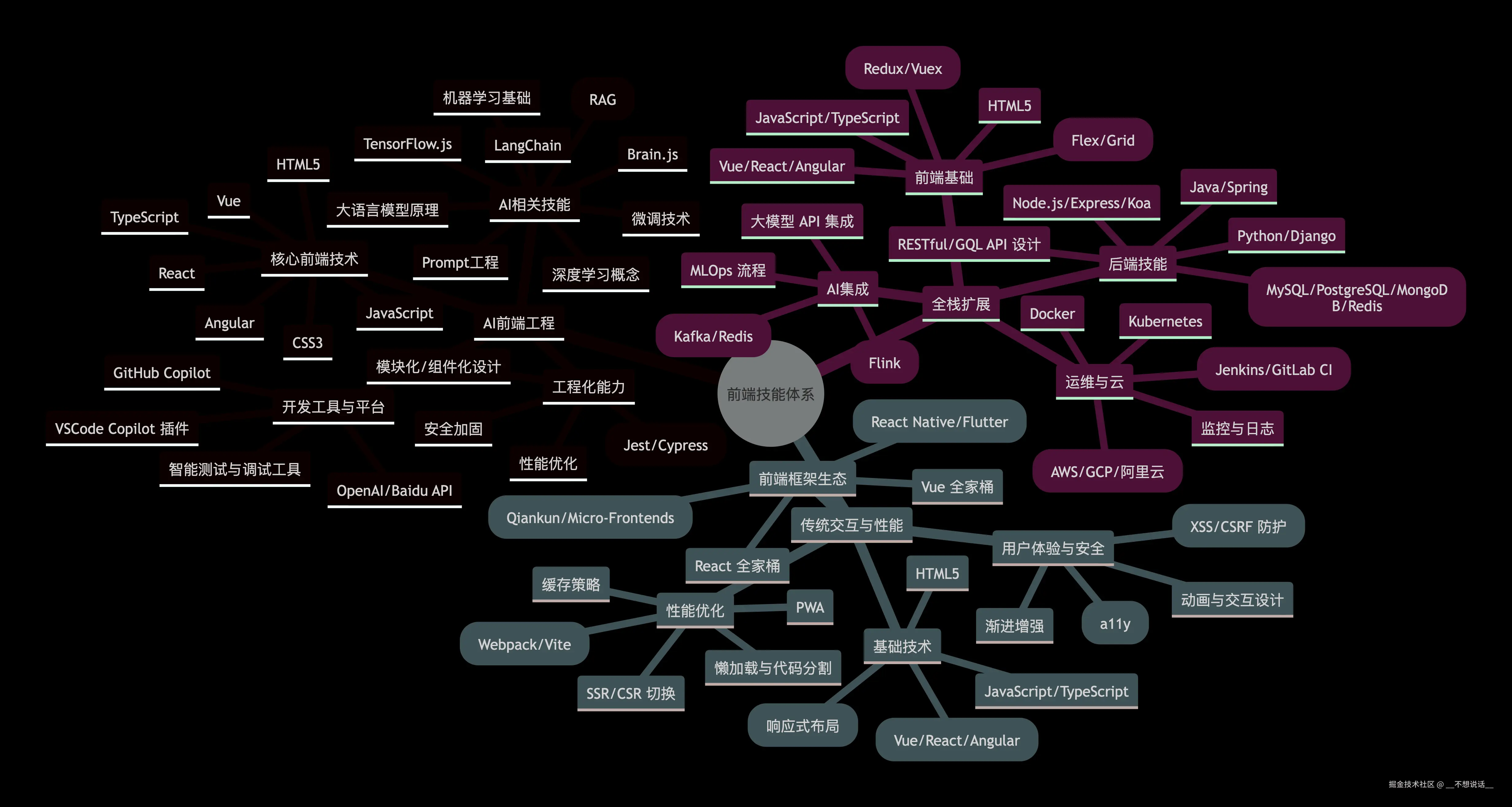 | 前端框架生态 | Vue 全家桶, React 全家桶, 微前端框架 (Qiankun/Micro-Frontends), 跨端开发 (React Native/Flutter) |