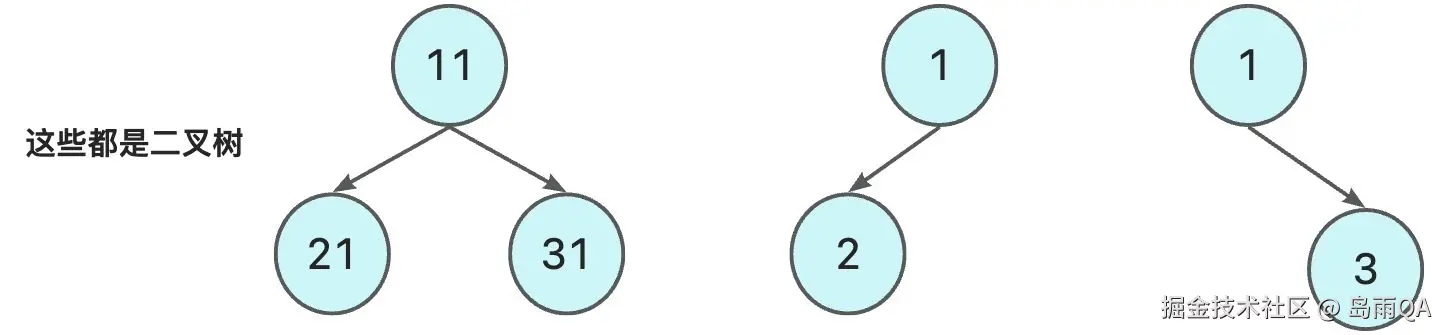 - 树有很多种,每个节点最多只能有两个子节点 的一种形式称为二叉树。