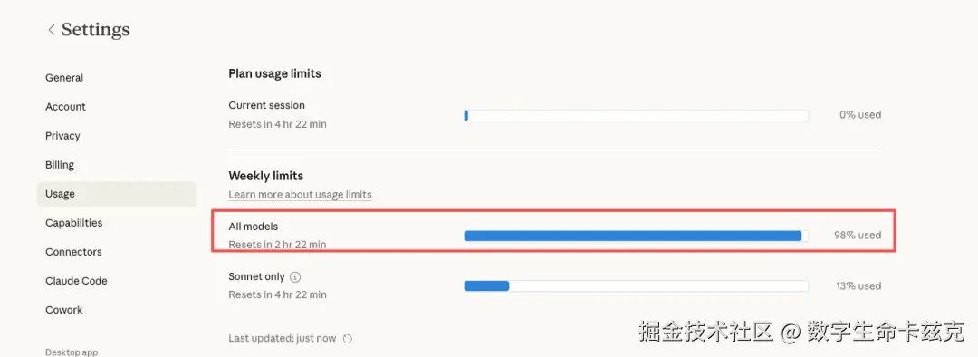 真的,有图为证,我Max的额度都被干空了,我是周三晚上10点刷新,昨晚8点多的时候,最后那2%的额度我都不敢用,能用GPT我就用GPT了,我就怕有个啥急事我额度空了就炸了。