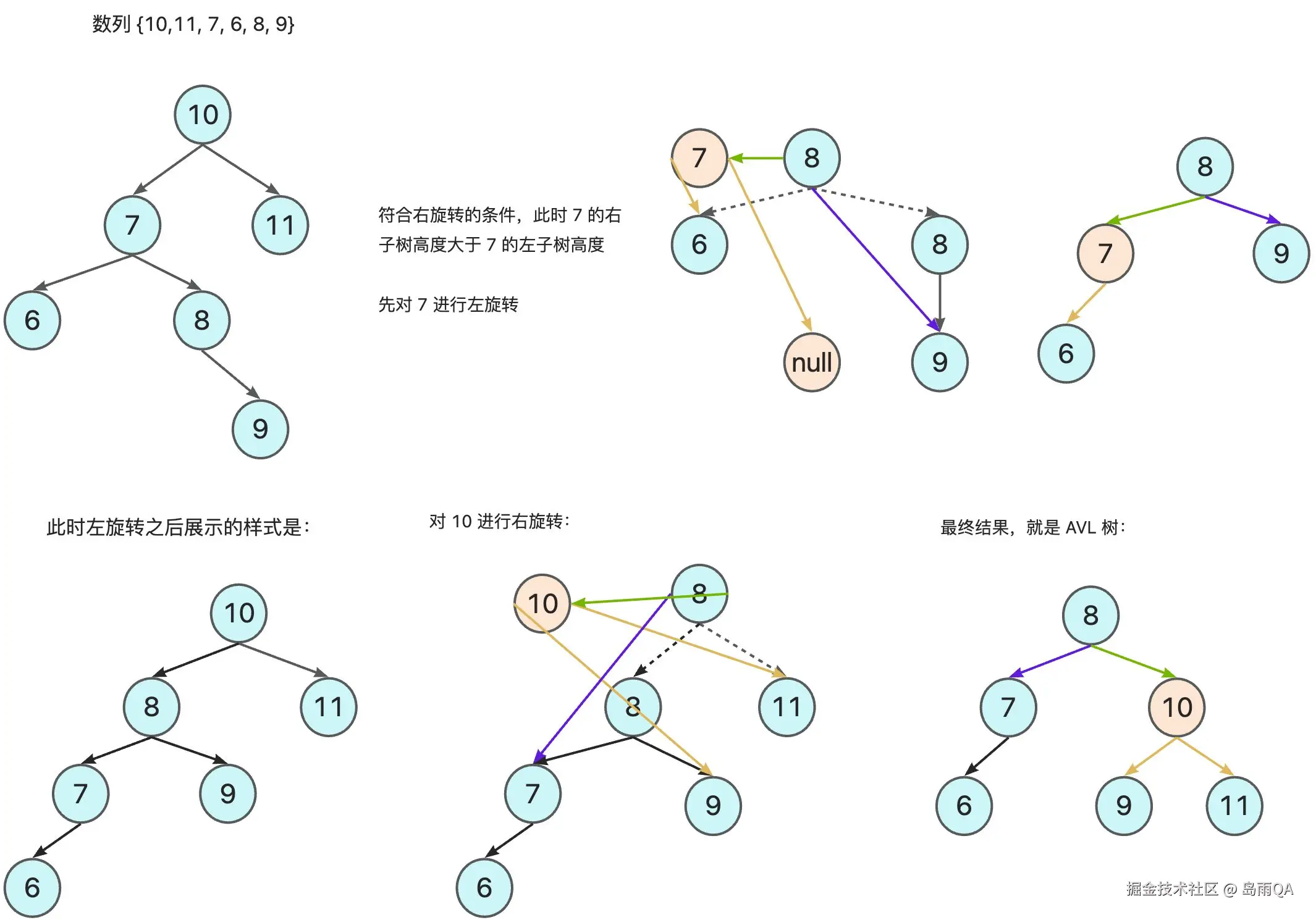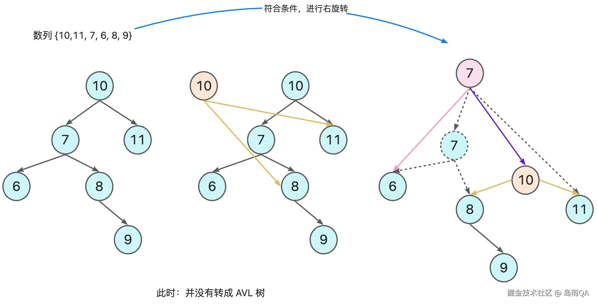 int[] arr = { 10, 11, 7, 6, 8, 9 }; // 运行原来的代码可以看到,并没有转成AVL树