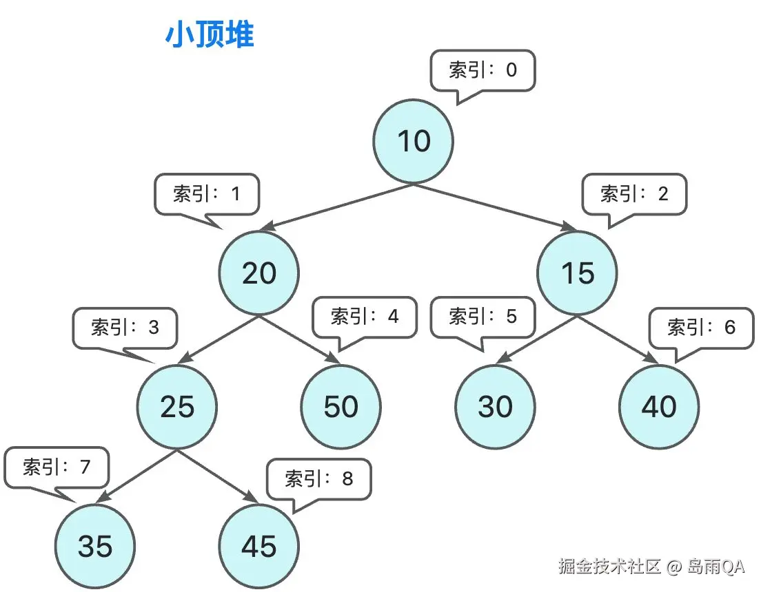 小顶堆:arr[i] <= arr[2i+1] && arr[i] <= arr[2i+2] // i 对应第几个节点,i从0开始编号