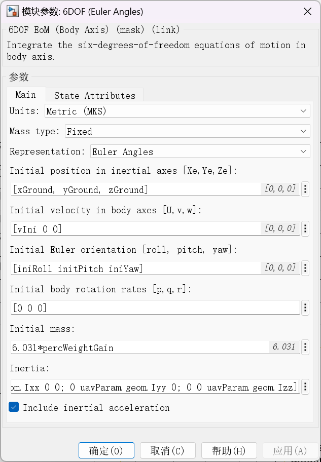 6DOF模块分为很多种类型,本次主要先介绍基于欧拉角的六自由度模块-6DOF (Euler Angles) 。模块是整个无人机物理仿真模型的绝对核心 。如果你把前面的 Rotor 模块比作无人机的"肌肉"(产生力量),那么这个模块就是"物理定律引擎",将会决定机身如何响应这些力量。该模块专门用于求解刚体六自由度空间运动的 牛顿-欧拉方程。