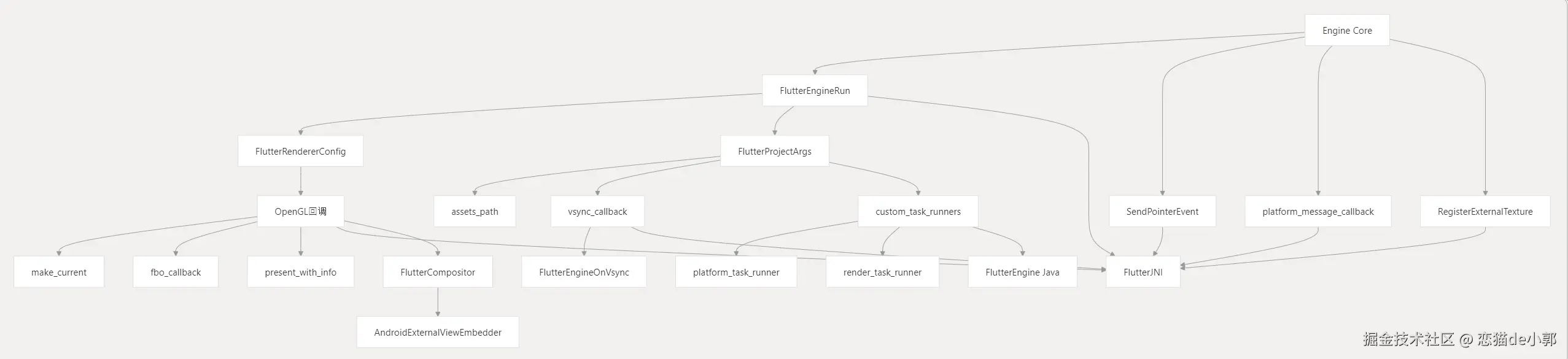 assets_path:Flutter 资源目录icu_data_path:icudtl.dat(国际化/文字相关)platform_message_callback:平台消息回调- AOT/JIT 所需的快照相关字段(AOT 需要提供一组 snapshot 指针;JIT 需要 assets 里有 kernel blob)