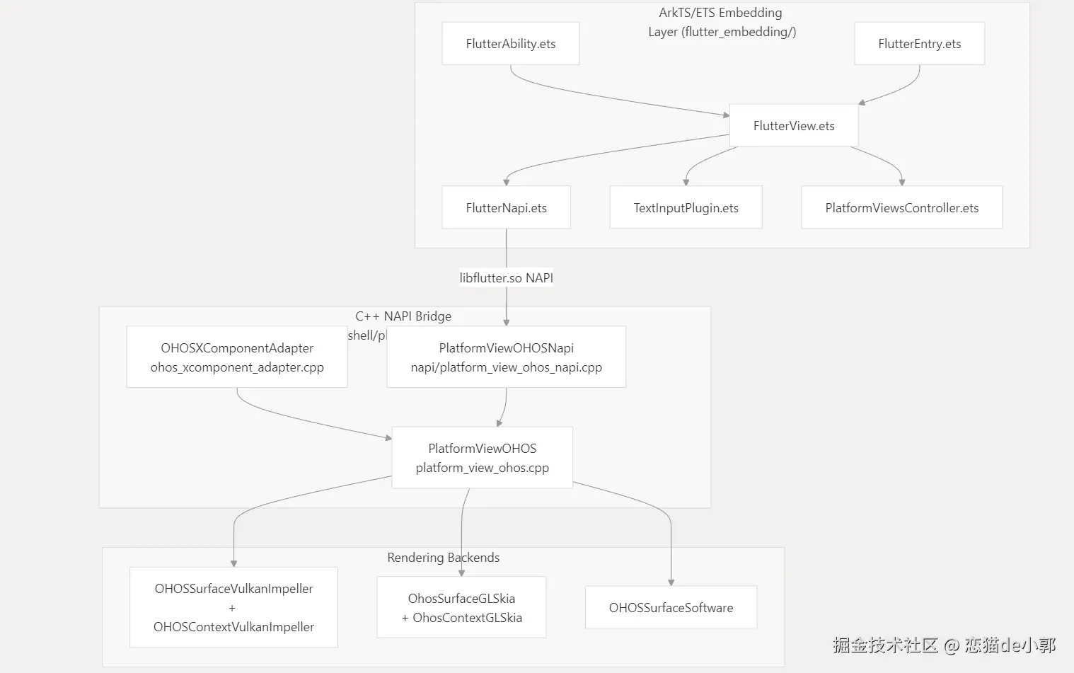 engine/src/flutter/shell/platform/ohos/:C++ 原生层实现,包含平台适配、渲染后端、NAPI 桥接等engine/src/flutter/shell/platform/ohos/flutter_embedding/:ArkTS 嵌入层实现,提供 Flutter 应用在鸿蒙上的运行时环境