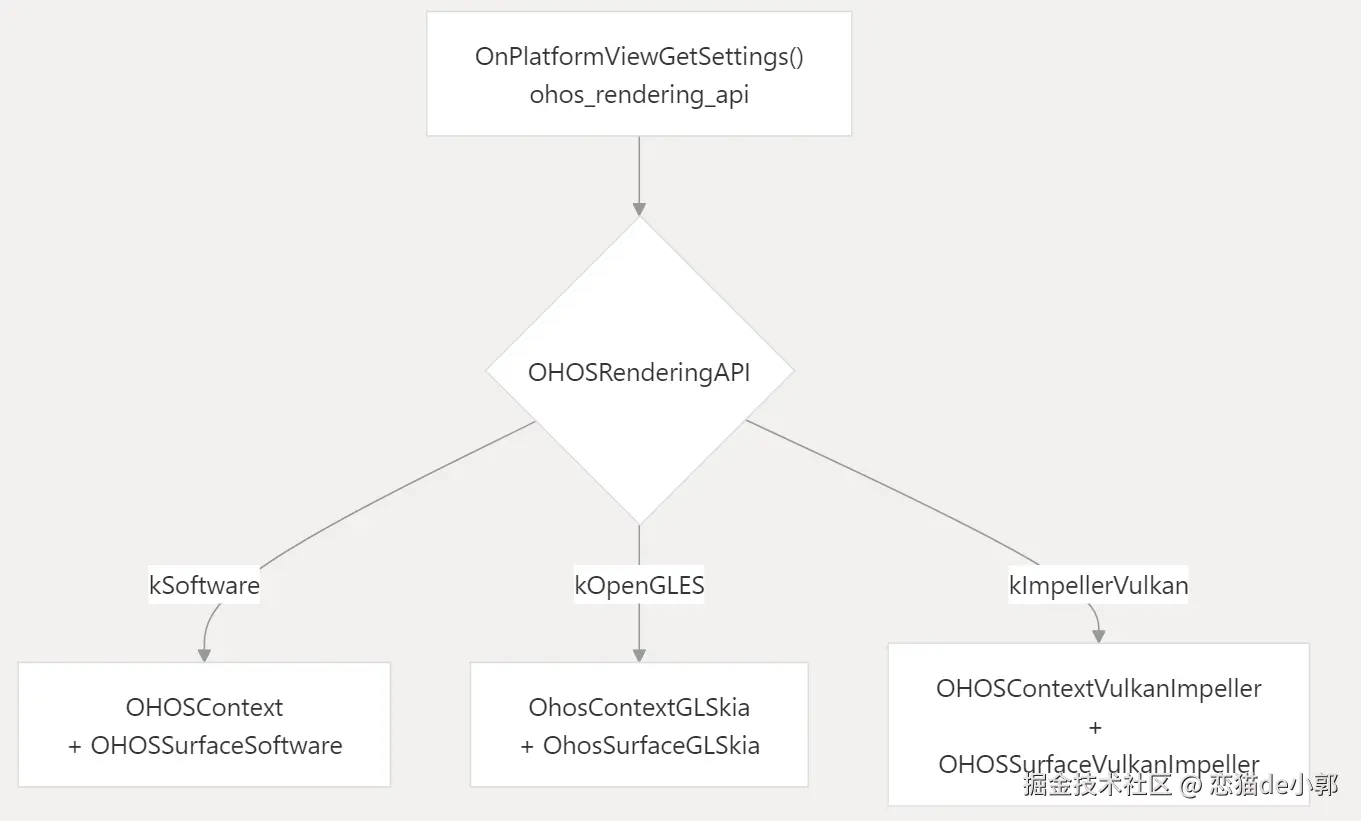 然后每个 Flutter 实例对应一个 OHOSShellHolder,持有完整的 Flutter Shell:ohos_shell_holder,OHOS 通过自己的抽象层(OHOSContext/OHOSSurface)和 NAPI 桥接,不直接构造 FlutterRendererConfig,而是由 PlatformViewOHOS 的 CreateRenderingSurface() 返回对应的 Surface 和 CreateOHOSContext 返回渲染上下文