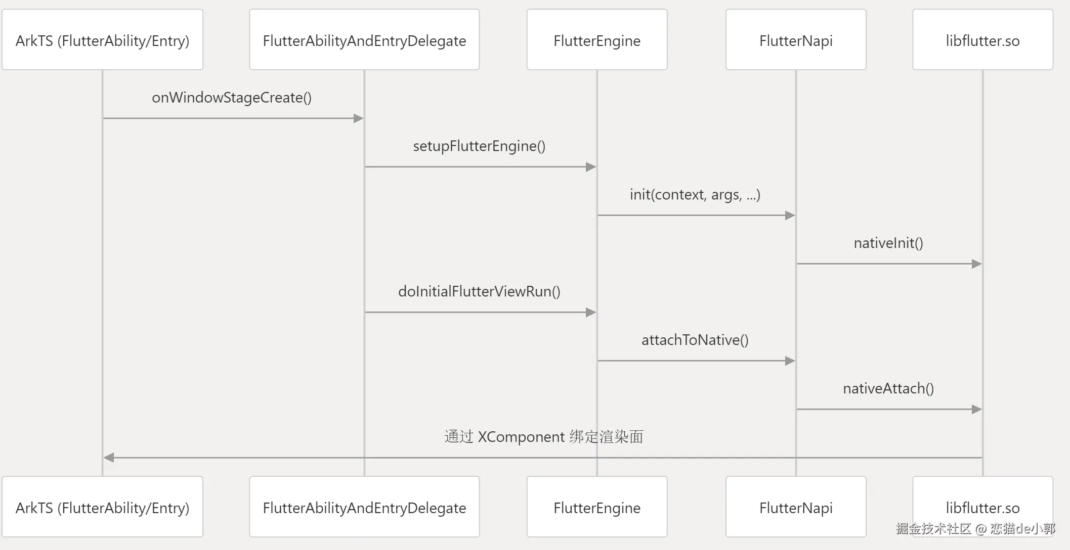 FlutterNapi.init(),传入bundlePath (应用包路径)、appStoragePath(应用存储路径)、engineCachesPath(引擎缓存路径)、args(命令行参数)、initTimeMillis(初始化时间戳)、productModel` (设备型号) 等参数 FlutterNapi.xComponentAttachFlutterEngine()将XComponent和 native Shell 绑定,核心是将xcomponentId与nativeShellHolderId
