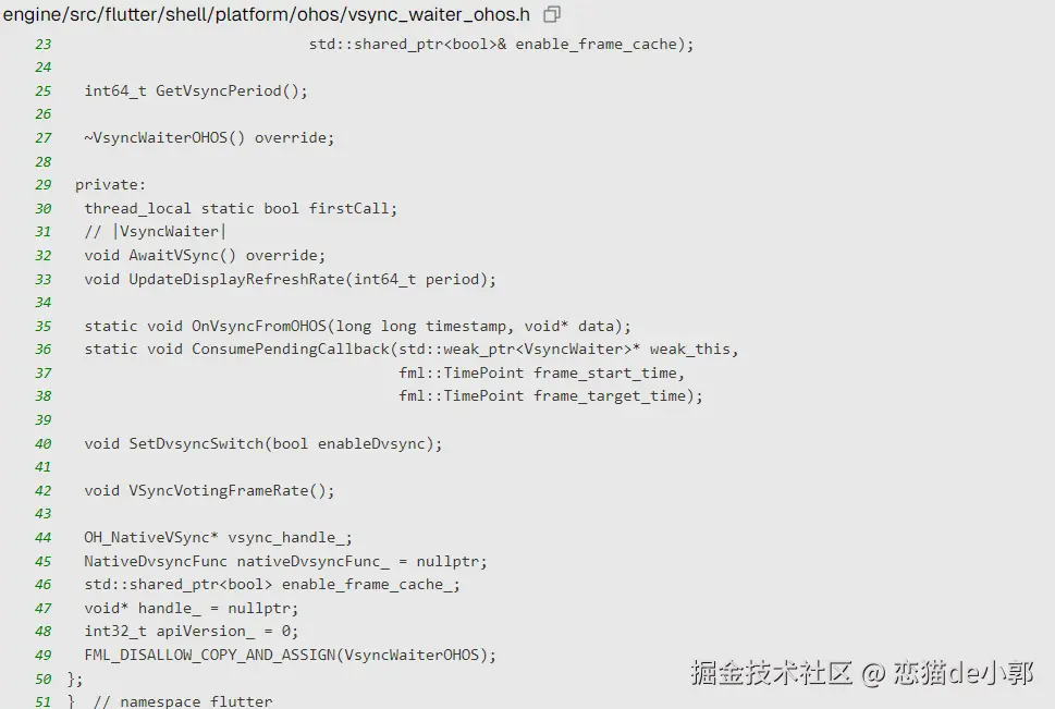 4、OH_NativeVSync 原生 VSync 信号驱动帧渲染,VsyncWaiterOHOS 负责等待信号并触发帧调度,同时支持帧缓存模式的 Dvsync 开关: