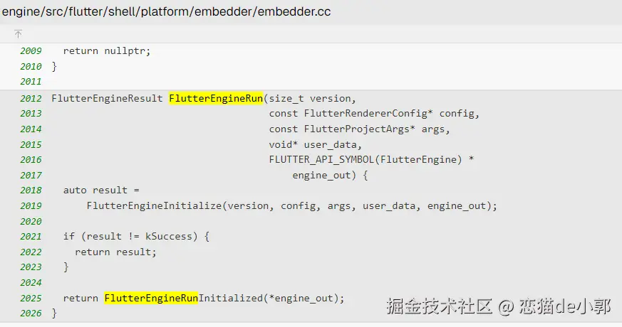 核心是 FlutterEngineRun(...) ,它是通用的嵌入层入口,开发者要提供 FlutterRendererConfig(渲染后端配置)和 FlutterProjectArgs(资源、回调、快照等)来满足 Flutter 运行的环境,例如 FlutterProjectArgs 里最常见是: