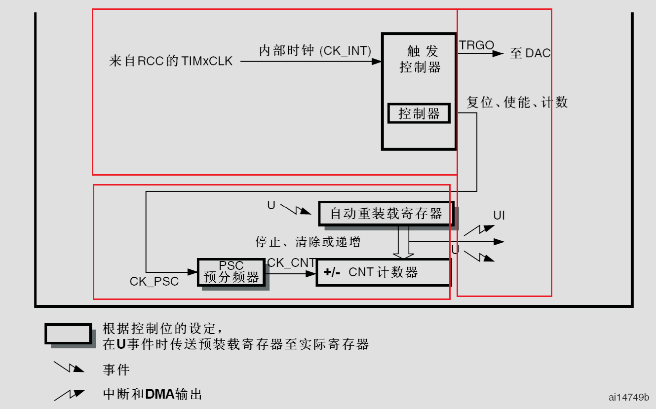 从STM32F10xx参考手册中我们可以找到基本定时器对应的定时器框图