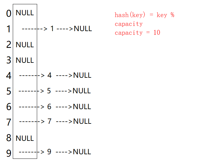 例如我们现在有一个数据集合{1,7,6,4,5,9},哈希函数设置为hash(key) = key % capacity其中capacity为容器底层的空间总大小。
