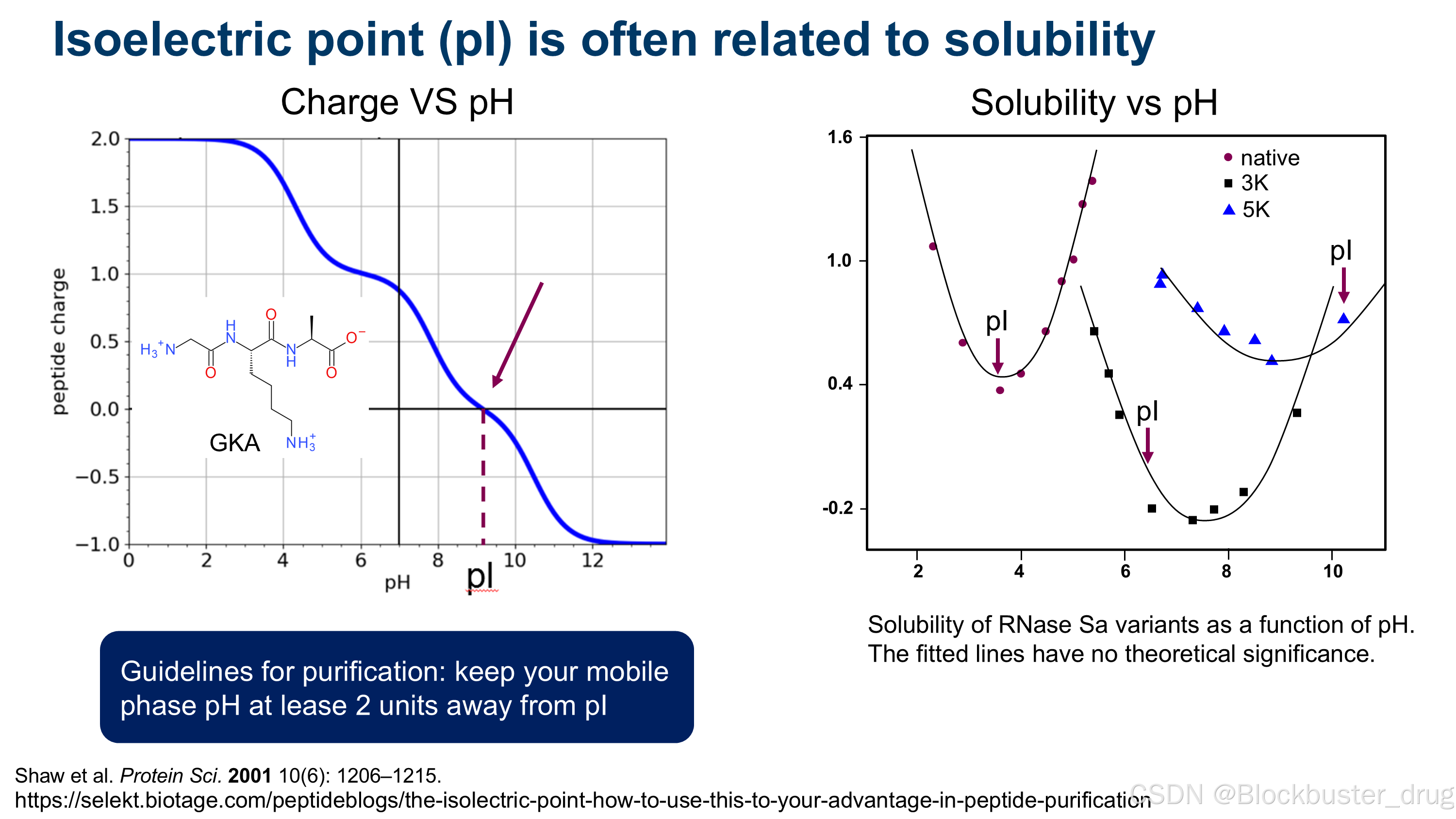 - 对于碱性多肽 (含较多 Lys/Arg/His),pI 通常位于两个最高的碱性 pKa之间;